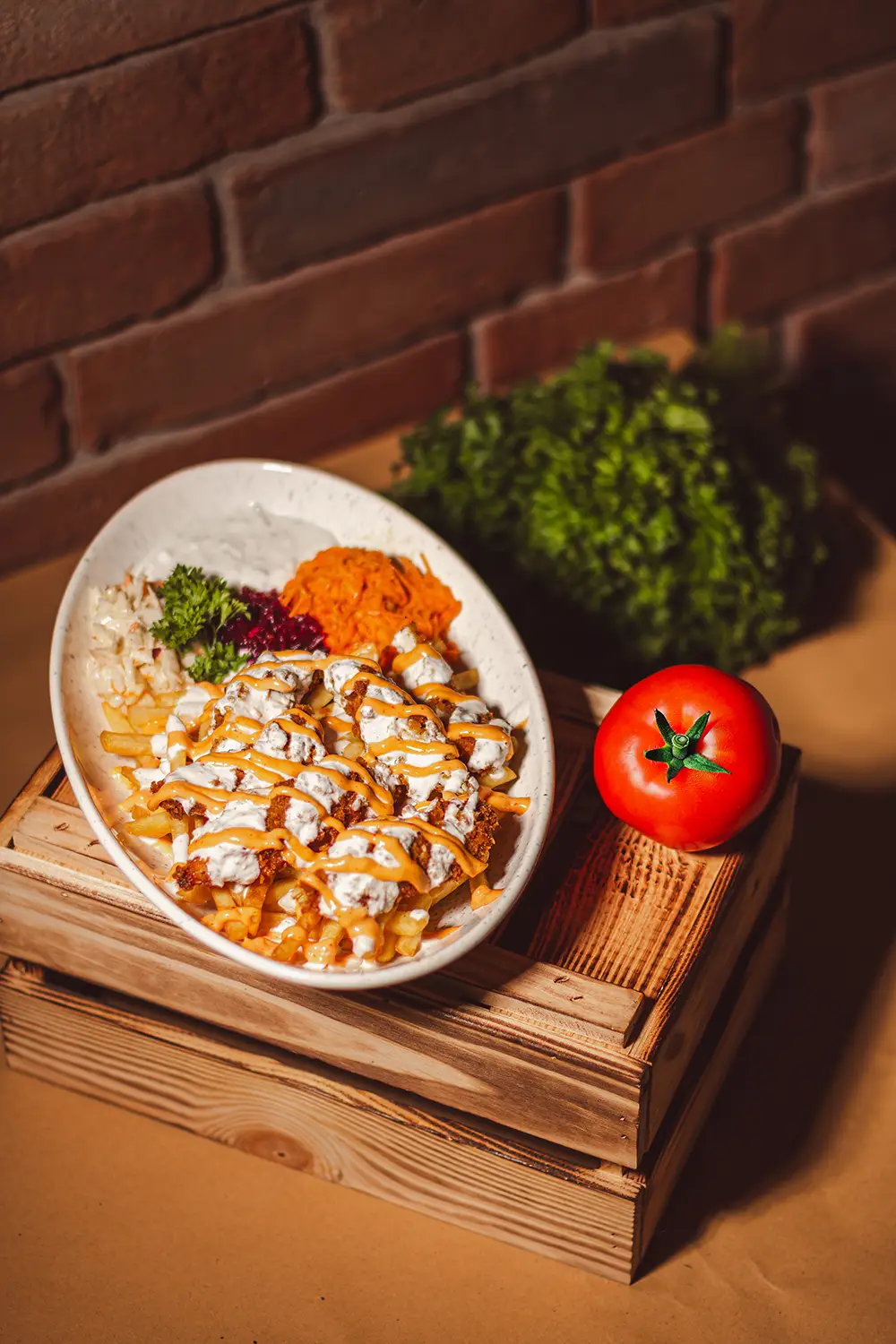 Frytki 150g, karkówka grillowana 120g, ser żółty, kapusta pekińska, cebula czerwona, ogórek zielony, pomidor, kukurydza, sos ostry, sos czosnkowy i ketchup