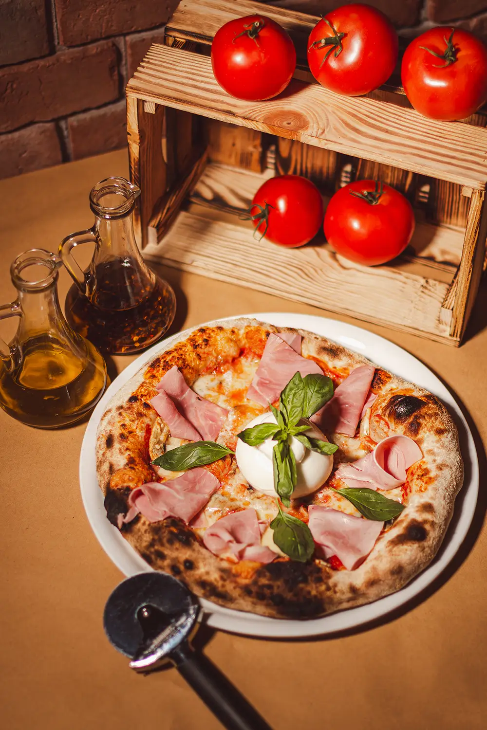 Farsz pieczarkowy, salami, ser żółty, kukurydza, szczypiorek, ogórek szwedzki, pomidor, sos czosnkowy, ketchup