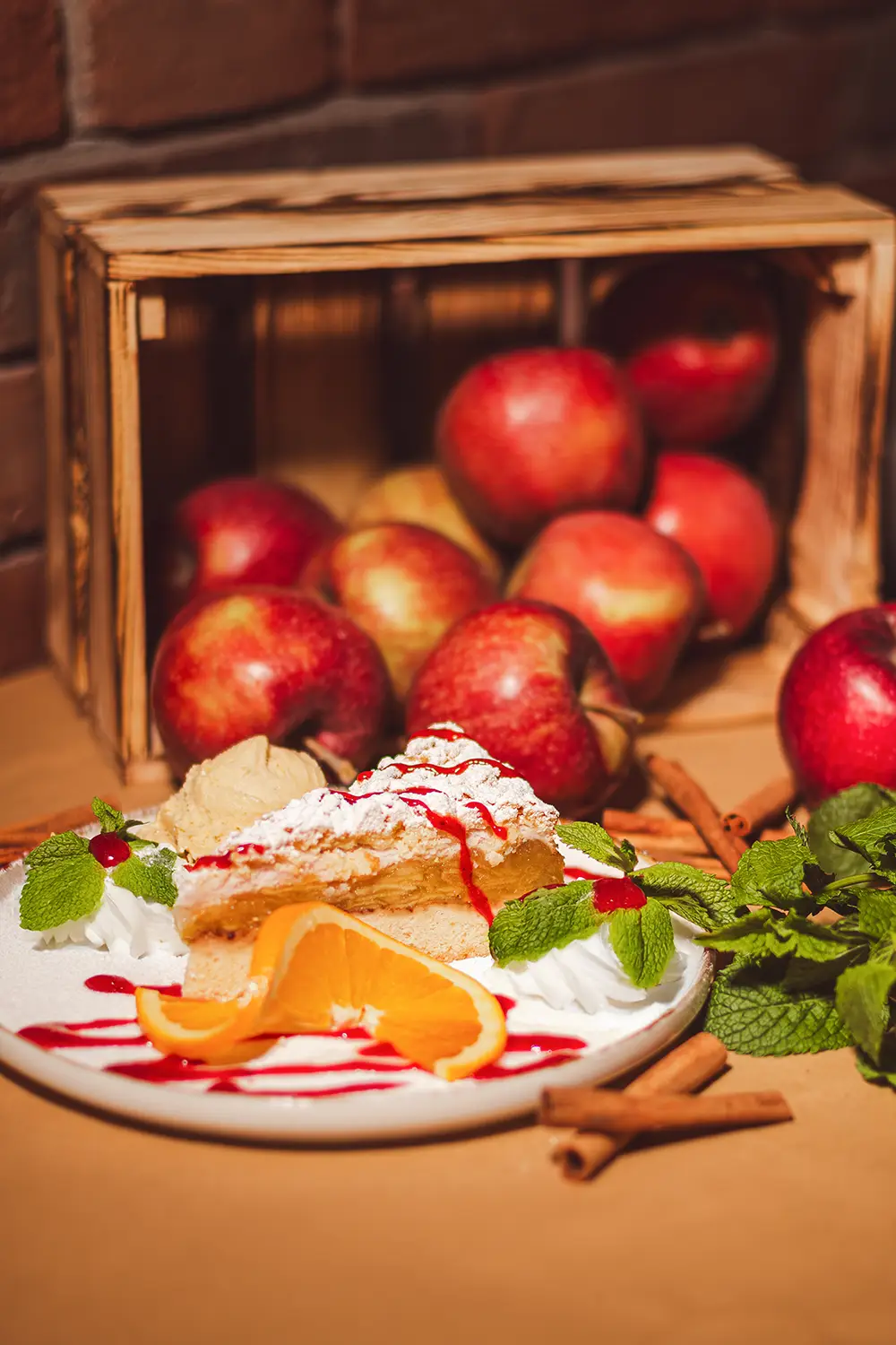 Podawana z bitą śmietamą, gałką lodów oraz musem owocowym