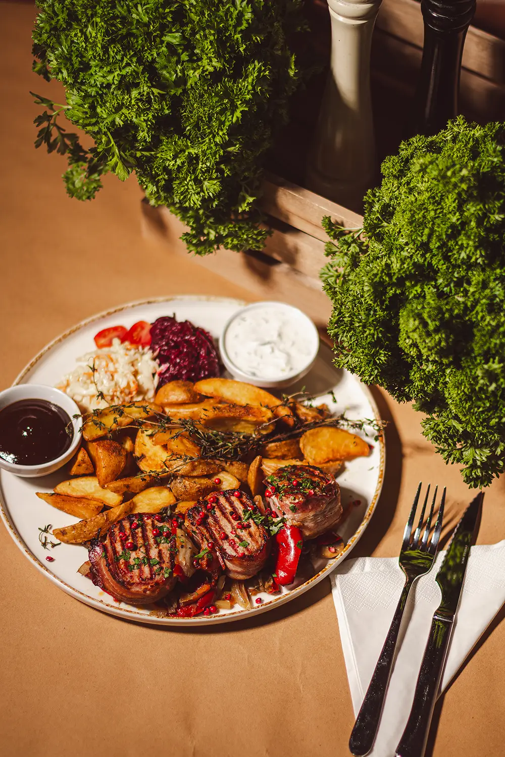 Polędwiczka wieprzowa 200g w otulinie boczku, serwowana z opiekanymi ziemniakami, zestawem surówek i sosem tzatziki