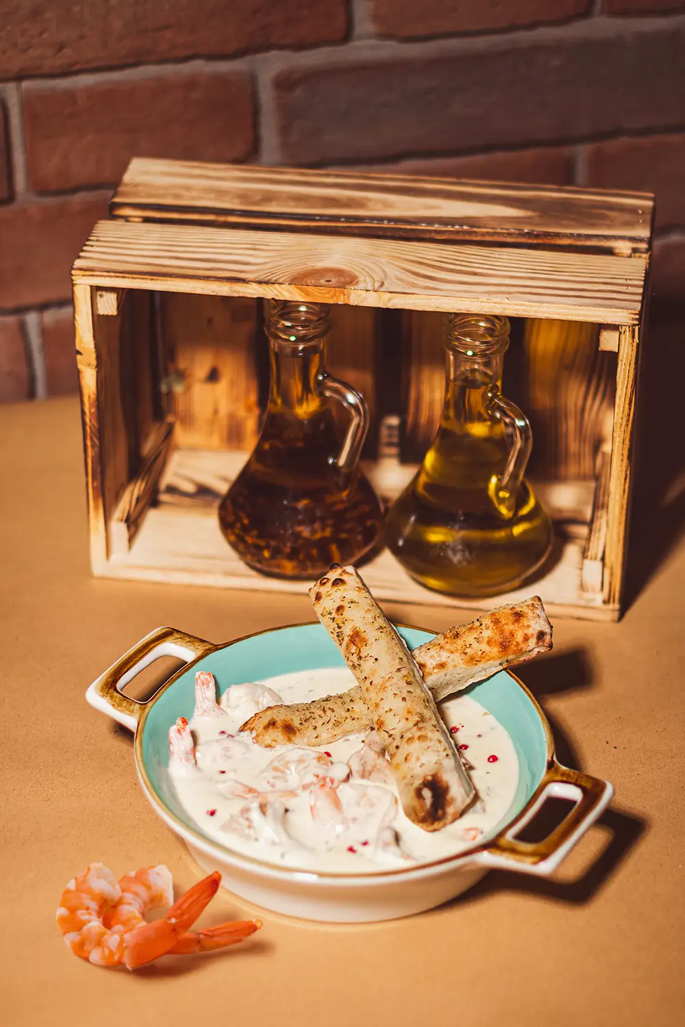 Krewetki smażone na maśłe z imbirem i czosnkiem, otulone aksamitnym sosem śmietankowym z kurkami i orzeźwiającą nutą soku z limonki. Serwowane z paluchami z ciasta do pizzy.