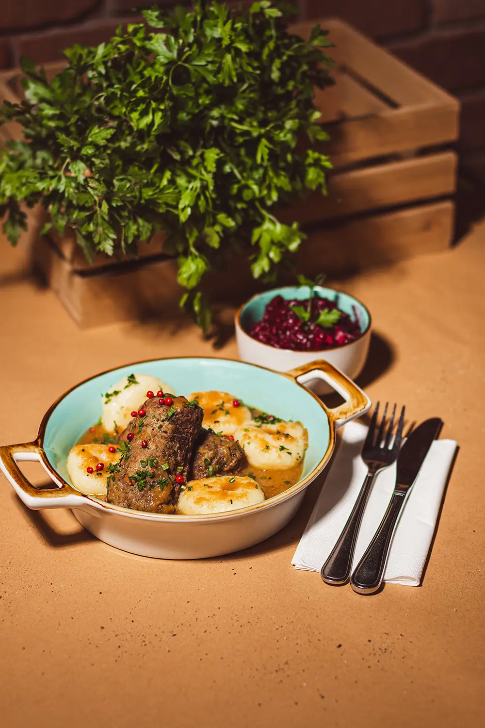 Roladka wołowa 200g, wypełniona farszem w sosie własnym, serwowana z kluskami śląskimi okraszonymi cebulką i ćwikłą