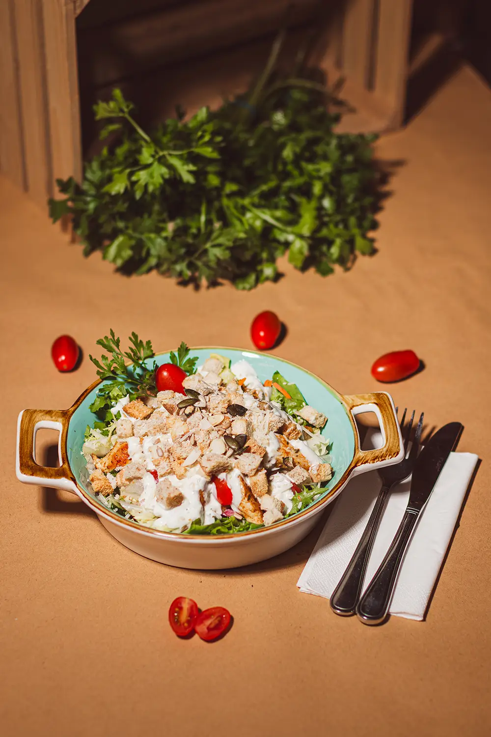 Mix sałat, pomidor, ogórek, papryka, cebula czerwona, oliwki, ser feta całość polana dressingiem podawana z dwiema grzankami czosnkowymi