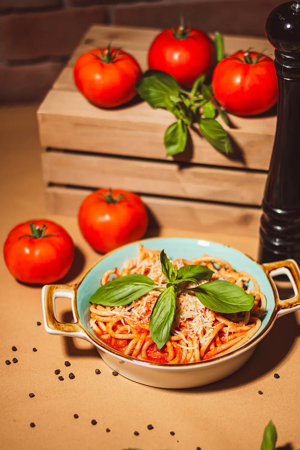 Makaron Bucatini w sosie z pomidorów Pelatti, boczek Pancetta, czosnek, Grana Padano