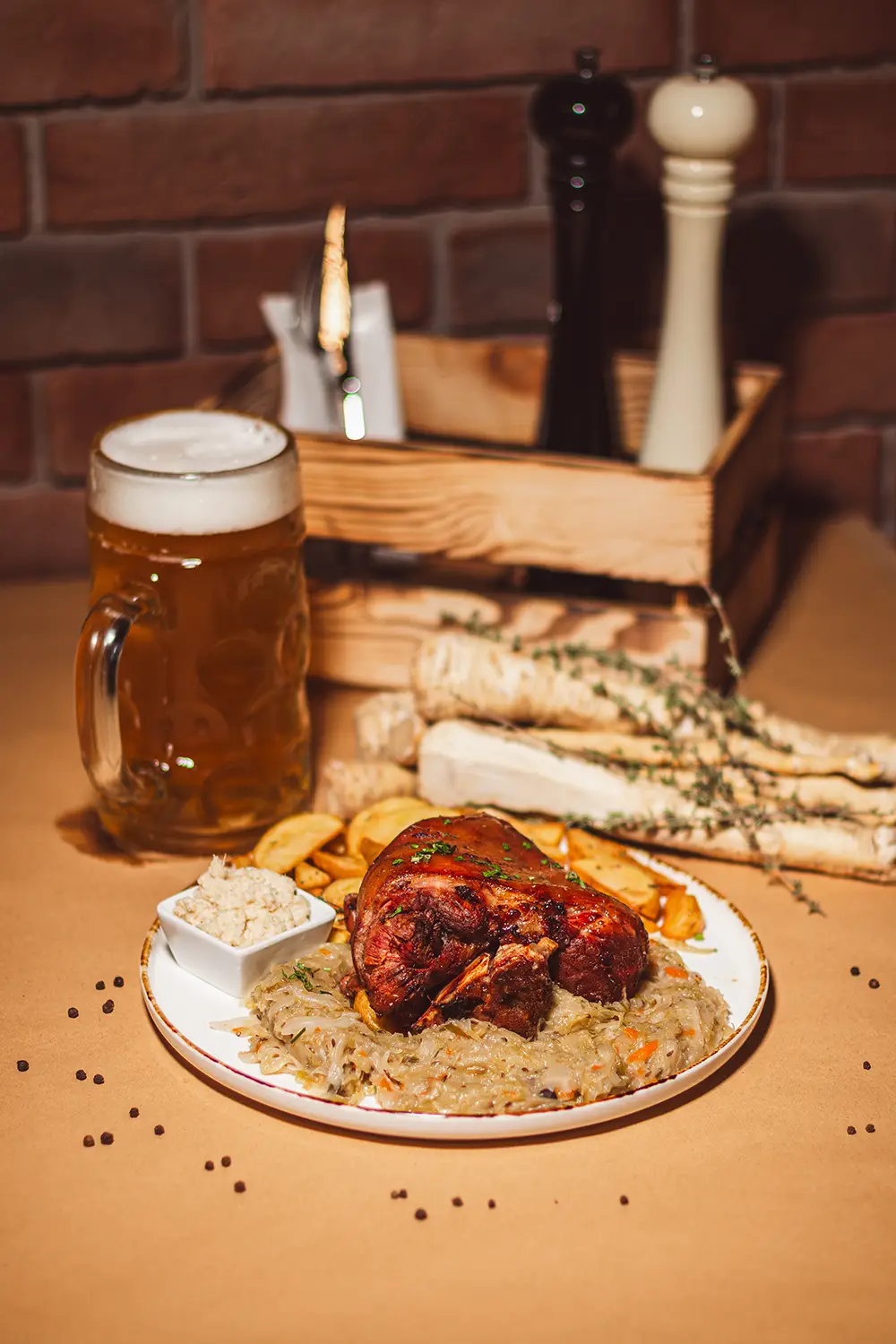 Soczysta golonka z kością (400-600g), pieczona w piwie, serwowana z chrupiącymi ziemniakami opiekanymi, kapustą zasmażaną i chrzanem