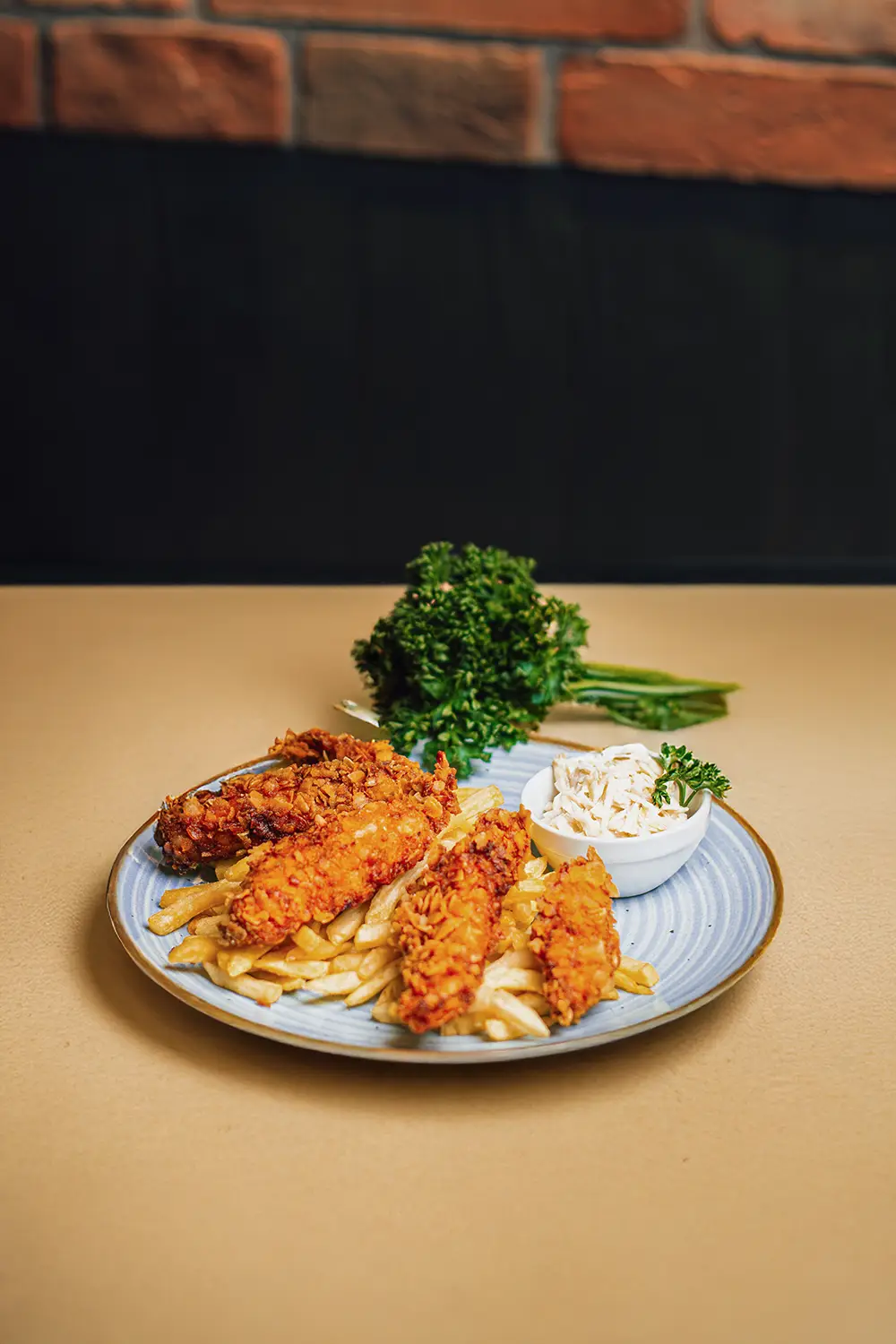 Filet z kurczaka w chrupiącej panierce 160g z frytkami, polany łagodnym (sos tzatziki) i pikantnym sosem z zestawem surówek